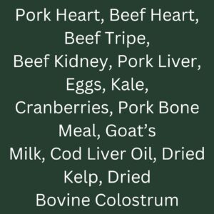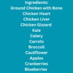 Ingredient Statement: Ground chicken with bone, heart, liver, gizzard, kale, celery, yellow squash, carrots, broccoli, green beans, cauliflower, apples, cranberries, and blueberries.