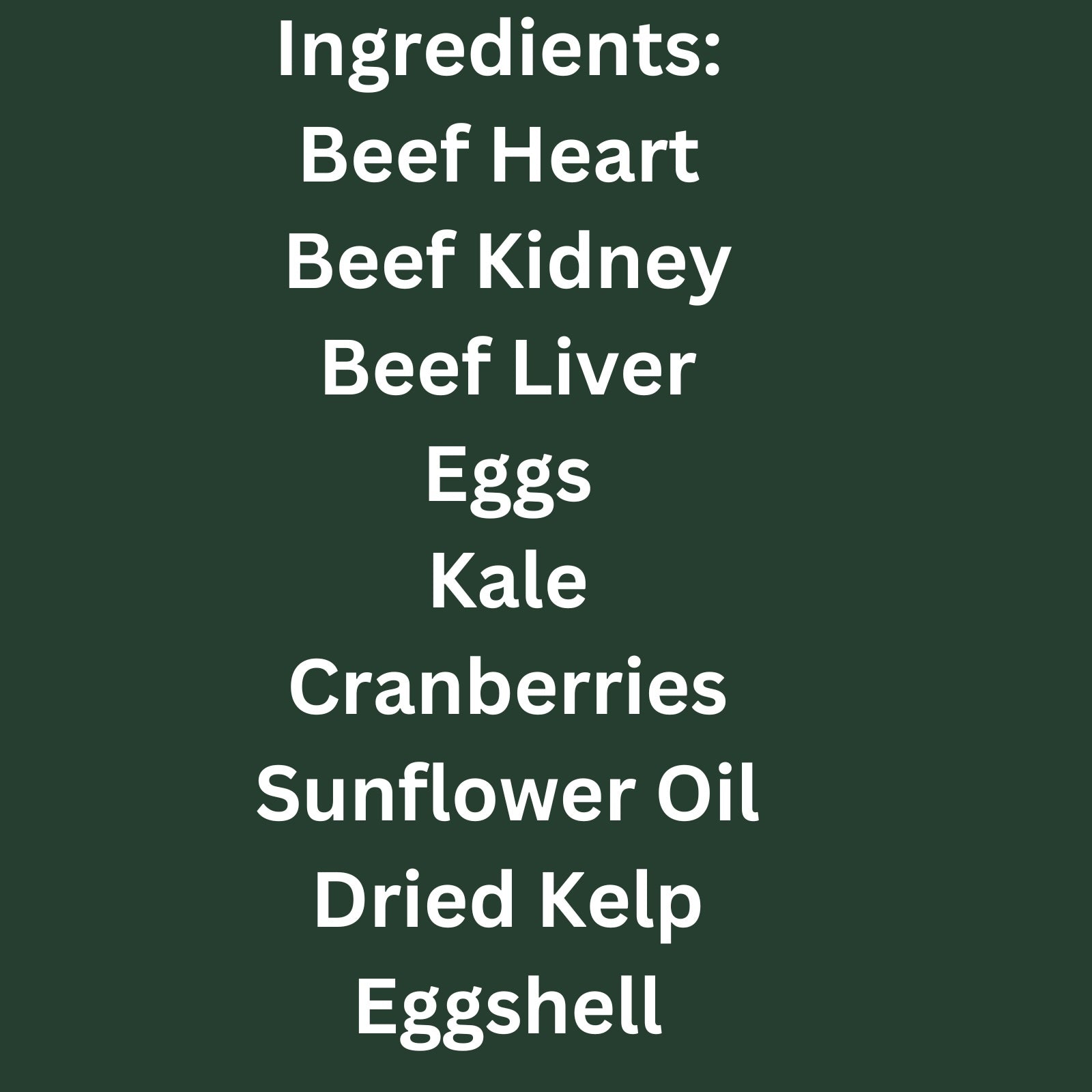 Ingredients: Beef Heart, Beef Kidney, Beef Liver, Eggs, Kale, Cranberries, Sunflower Oil, Organic Dried Kelp, Eggshell