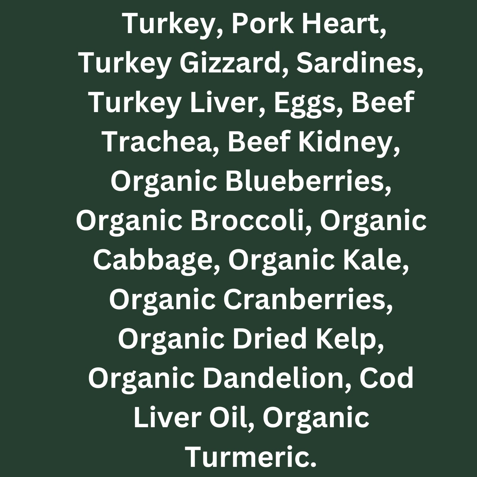 Ingredients: Turkey, Pork Heart, Turkey Gizzard, Sardines, Turkey Liver, Eggs, Beef Trachea, Beef Kidney, Organic Blueberries, Organic Broccoli, Organic Cabbage, Organic Kale, Organic Cranberries, Organic Dried Kelp, Organic Dandelion, Cod Liver Oil, Organic Turmeric.