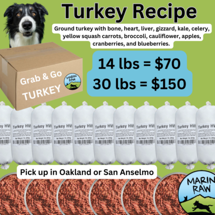 5 lbs Turkey Recipe: Ground turkey with bone, heart, liver, gizzard, kale, celery, yellow squash, carrots, broccoli, cauliflower, green beans apples, cranberries, and blueberries.