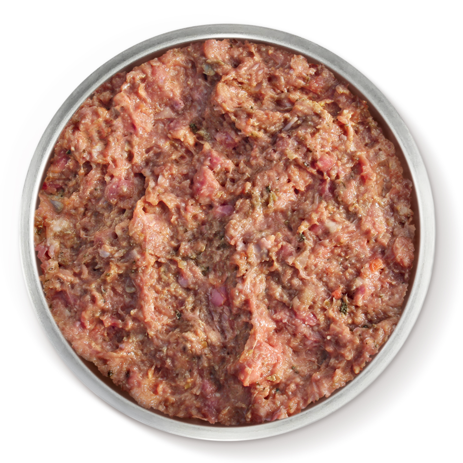 - Includes 72.5% muscle meat, 10% bone, 10% organs, and 7.5% fruits and vegetables.