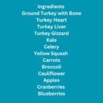 Ingredient Statement: Ground turkey with bone, heart, liver, gizzard, kale, celery, yellow squash, carrots, broccoli, cauliflower, green beans, apples, cranberries, and blueberries.